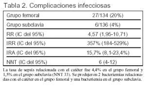 Artículo: Merrer J, De Jonghe B, Golliot F, Lefrant JY, Raffy B, Barre E, et al, for the French Catheter Study Group in Intensive Care. Complications of femoral and subclavian venous catheterization in critically ill patients. A randomized controlled trial. JAMA 2001;286:700-7.