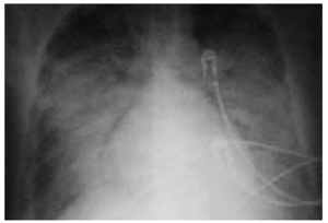 Figura 1. Radiografía de tórax en la que se observan infiltrados alveolares bilaterales y derrame pleural derecho.