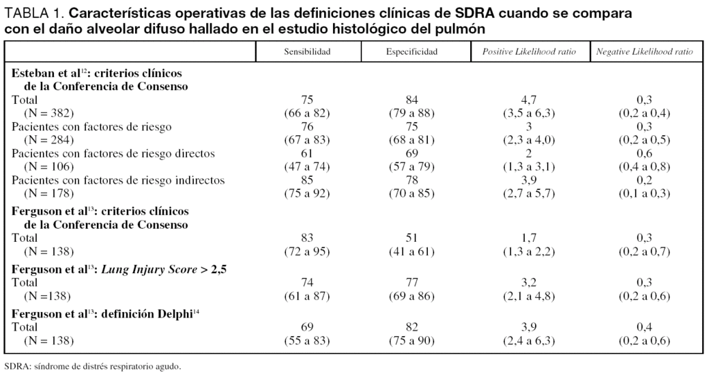 Esteban et al12 encontraron que la exactitud de la definición de la Conferencia de Consenso fue moderada. En todos los pacientes incluidos (N = 382), la sensibilidad de los criterios de la Conferencia de Consenso fue 75% (intervalo de confianza para el 95%: 66 a 82) y la especificidad fue 84% (intervalo de confianza para el 95%: 79 a 88). Cuando se analizaron los pacientes con factores de riesgo para SDRA (N = 284) la especificidad disminuyó a 75% (intervalo de confianza para el 95%: 68 a 81) con una sensibilidad similar. La definición fue más exacta en pacientes con factores de riesgo extrapulmonar que en pacientes con factores de riesgo pulmonar: sensibilidad 61% frente a 85% (p = 0,009), mientras que la especificidad fue numéricamente mayor pero no diferente estadísticamente (69% frente a 78%; p = 0,25) (tabla 1).