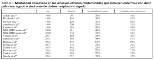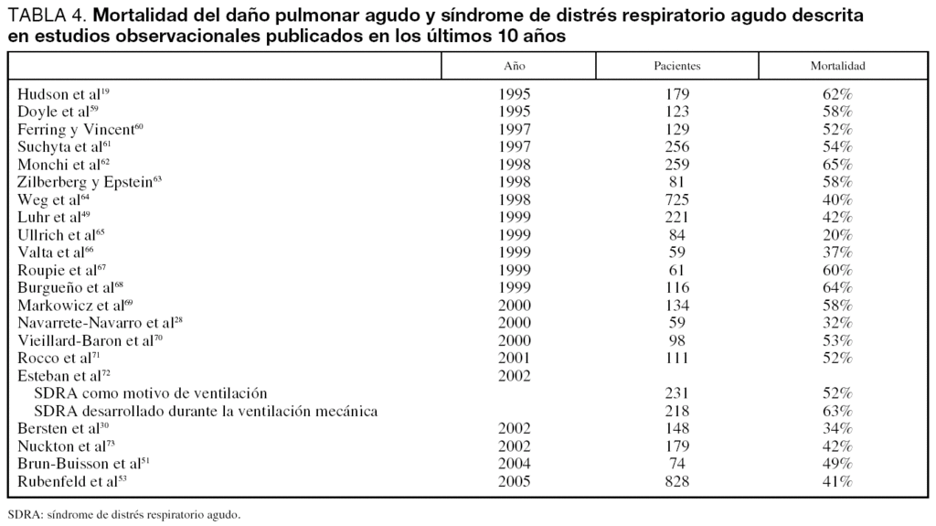 La mortalidad observada en los estudios publicados desde 1995 está entre un 20% y un 71% dependiendo del case-mix incluido en el estudio19,30,49,51,53,59-88. Es interesante la observación de que la mortalidad reportada en ensayos clínicos randomizados es inferior a la descrita en estudios observacionales (tablas 4 y 5). Probablemente, la principal razón para explicar estas diferencias es la selección de enfermos que se realiza para su inclusión en los ensayos clínicos. Suchyta et al89 observaron una mortalidad significativamente mayor en los enfermos que no fueron recogidos en tres ensayos clínicos de la ARDS network en comparación con los enfermos incluidos (44% frente a 34%).