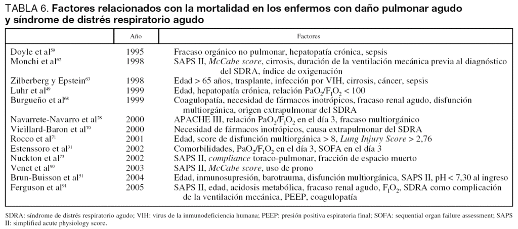 Múltiples factores han sido relacionados con la mortalidad de los enfermos con daño pulmonar agudo o SDRA (tabla 6), siendo el fracaso multiorgánico la causa más frecuente de muerte.