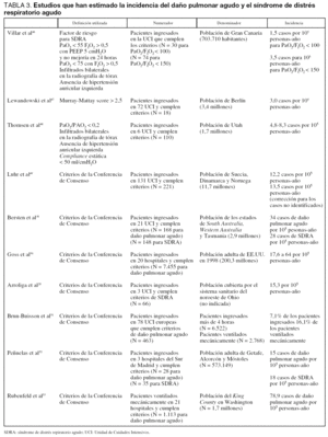 La primera estimación realizada por un panel de expertos fue de 70 casos por 100.000 habitantes45. Varios estudios posteriores29,30,46-53 han estimado la incidencia entre 1,5 y 80 casos por 100,000 habitantes-año (tabla 3). Aproximadamente, entre un 18% y un 25% de los casos cumplen criterios de oxigenación para daño pulmonar agudo pero no para SDRA. La variación en los resultados entre los estudios son debidos a diferencias en la metodología utilizada para calcular la incidencia como son diferencias en el denominador, tipo de hospital, criterios de ingreso en las UCI y criterios diagnósticos de SDRA.
