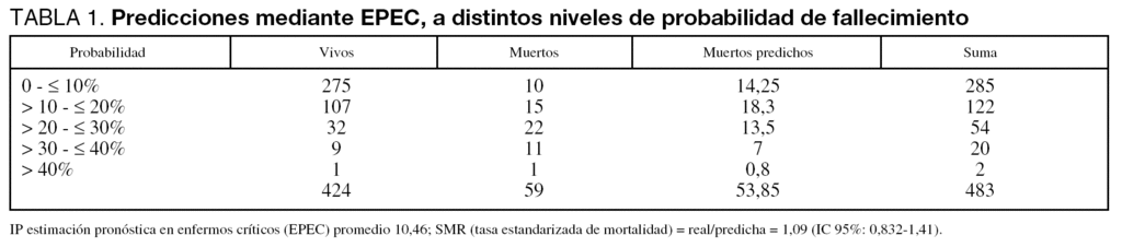 Estas aparentes similitudes de capacidad pronóstica se ven comprometidas al analizar la calibración obtenida y realizar los cálculos de resolución de las tablas de contingencia construidas alrededor de distintas probabilidades de mortalidad. EPEC no permite analizar adecuadamente la calibración al no existir, por este método, una probabilidad de muerte superior al 50%, y a ello se debe añadir el análisis comparativo de la SMR frente a MPM II 0 y SAPS II. Mientras que estos métodos no ofrecen diferencias significativas entre ellos al establecer la comparación entre predicciones de mortalidad y mortalidad real, EPEC sí aporta diferencias significativas frente a los dos métodos, considerados aquí como gold standards.