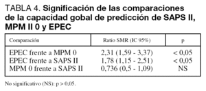 Los análisis de significación de las comparaciones entre la SMR de EPEC y de MPM II 0 y de SAPS II se muestran en la tabla 4, que permite comprobar cómo no existen diferencias significativas entre la SMR de los dos índices más consolidados y sí la hay entre la capacidad de predicción de cualquiera de ellos y EPEC.