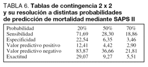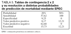 La resolución de las tablas de contingencia elaboradas sobre probabilidades de muerte del 20%, 50% y 70% se presenta en las tablas 5, 6 y 7. Debe destacarse que ninguno de los pacientes evaluados mediante EPEC presentó una probabilidad de muerte mayor del 50%, por lo que en este caso la tabla correspondiente muestra únicamente los datos de resolución alrededor de probabilidades del 20% y 50%.