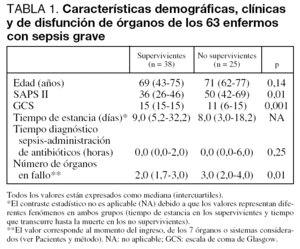 En el grupo estudiado la mediana de edad de los enfermos fue de 69 años (tabla 1). El 55% eran hombres. La mortalidad global del grupo de enfermos con sepsis grave fue del 40%.