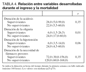 Los enfermos que fallecieron presentaron una mayor duración del tiempo de oliguria (p = 0,01) y de hipotensión (p = 0,06) (tabla 4).
