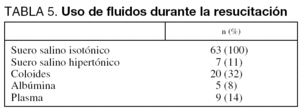 Todos los enfermos recibieron suero salino isotónico (tabla 5), el 40% albúmina u otros coloides, 9 pacientes recibieron plasma fresco (2 de ellos no presentaban coagulopatía) y 7 suero salino hipertónico como parte de la resucitación.