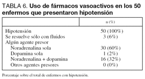 Los únicos agentes vasoactivos utilizados en los 47 pacientes que los precisaron durante las primeras 72 horas tras el diagnóstico fueron la noradrenalina, la dopamina y la dobutamina. El único caso que recibió dopamina como único agente presentó una corta duración del shock (2 días). Todos los demás casos recibieron noradrenalina sola (60% de los enfermos con hipotensión) o en combinación con dopamina a dosis inferiores a 5 µg/kg/min (32% de los enfermos con hipotensión). Sólo 4 casos (6% del total de enfermos con sepsis grave) recibieron dobutamina, todos ellos en conjunción con noradrenalina.