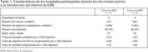 Criterios de inclusión: hospitales públicos con más de 20.000 ingresos anuales, que tuvieran una UCI y un servicio de urgencias y que no tuvieran en funcionamiento un sistema de equipo médico de emergencia (EME).