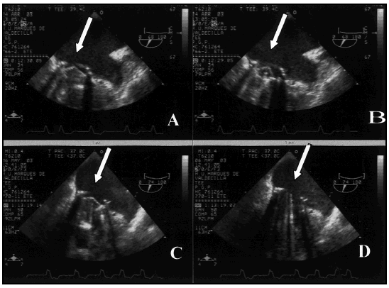 Figura 1. A y B: sístole y diástole prefibrinolisis, se aprecia uno de los discos fijo en diástole y el otro con apertura parcial (flechas). C y D: sístole y diástole posfibrinolisis, se aprecia la apertura completa de los discos (flechas).
