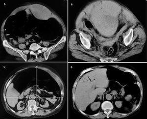Se trata de una mujer de 73 años que ingresó en un hospital comarcal a causa de dolor abdominal súbito coincidiendo con ataques repetidos de tos. La paciente estaba siendo tratada con acenocumarol y digital por fibrilación auricular y por ser portadora de una prótesis mitral metálica. A la exploración, la paciente estaba pálida y se palpaba una masa redondeada en la zona infraumbilical izquierda. Los principales datos analíticos revelaron una hemoglobina de 9,8 g/dl, un hematocrito del 29% y un ratio internacional normalizado (INR) de 9,4. Una ecografía abdominal mostró una masa líquida paraumbilical izquierda sugestiva de HVR. El tratamiento anticoagulante fue suspendido y se administraron concentrados de hematíes, plasma fresco congelado y vitamina K. A las 24 horas del ingreso y ante el aumento del tamaño de la masa abdominal se realizó una TC de abdomen sin contraste (fig. 1) que demostró un HVR izquierdo extendiéndose en el interior de la pelvis, una relación del diámetro abdominal anteroposterior y transverso de 0,82 y AVP hepático. Posteriormente, la paciente fue trasladada a la Unidad de Cuidados Intensivos (UCI).