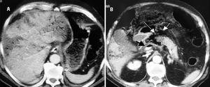 Figura 2. Tomografía computarizada abdominal con contraste que muestra gas venoso portal localizado en la periferia del hígado asociado con infartos hepáticos (A) y una zona de hipoperfusión en el cuerpo proximal del páncreas rodeada de aire peripancreático (flechas blancas) y un nivel de aire-material de contraste en la vena porta (flecha negra) (B).