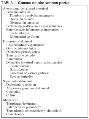 Aunque la formación del AVP es incierta, existen varios factores favorecedores como las alteraciones de la pared intestinal, la distensión intestinal y la sepsis intraabdominal. La tabla 1 muestra las principales etiologías del AVP según Sebastiá et al1, aunque debe destacarse que la causa más frecuente corresponde a la isquemia mesentérica con necrosis intestinal y que aproximadamente un 15% de los casos no tiene una etiología claramente identificable.