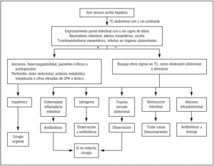 En conclusión, el AVP es un hallazgo radiológico raro que suele deberse a isquemia intestinal, aunque también puede observarse en situaciones no isquémicas como traumáticas, iatrogénicas, infecciosas u obstructivas. El pronóstico está ligado a la enfermedad subyacente, lo cual obliga a una evaluación adecuada del paciente con el fin de evitar demoras quirúrgicas fatales o laparotomías innecesarias. Cuando el AVP aparece asociado a isquemia mesentérica, la evolución clínica depende principalmente de la gravedad y extensión de la isquemia intestinal. La monitorización repetida de la presión intraabdominal puede detectar precozmente la aparición de un síndrome compartimental abdominal y la correspondiente disfunción orgánica.
