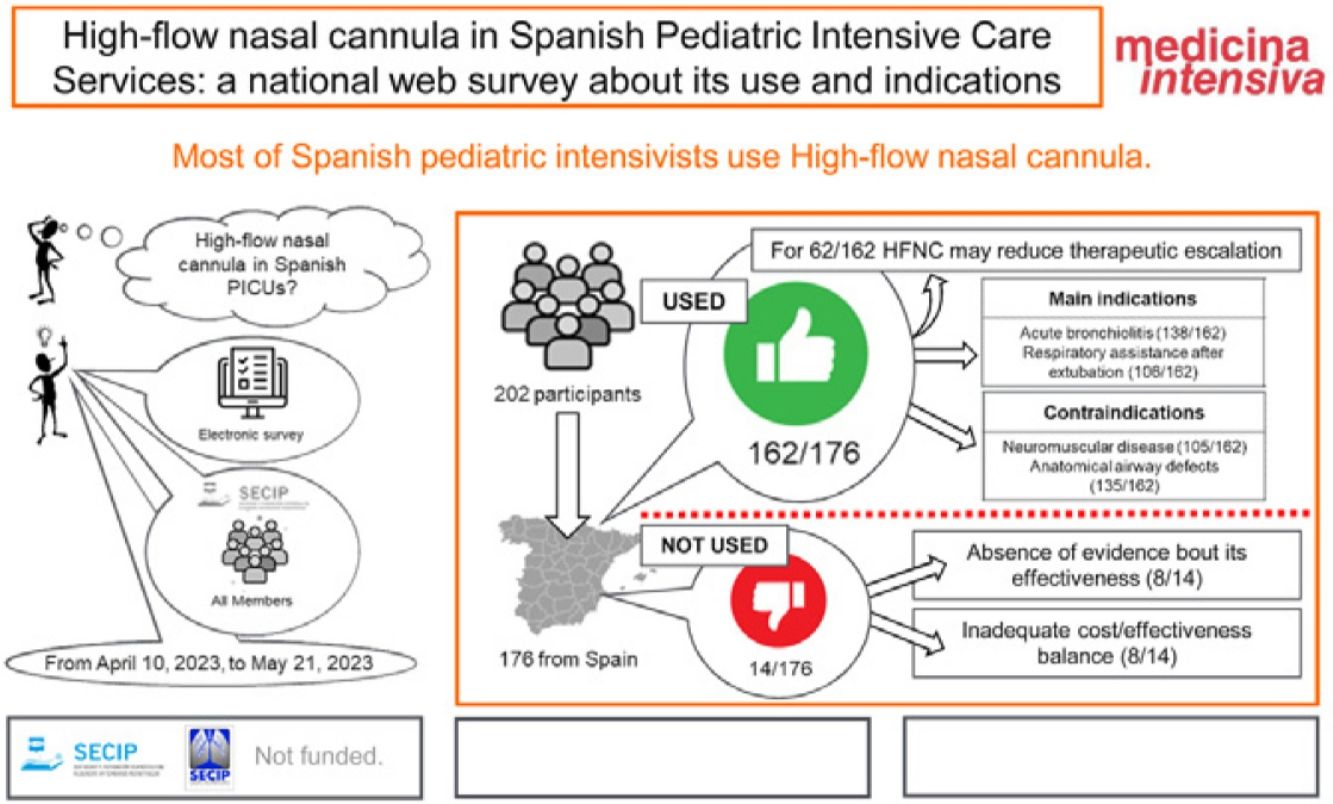 For all these reasons, this article presents the results of an electronic survey conducted among pediatricians who are members of the Spanish Society of Pediatric Intensive Care (SECIP). A demographic study of the participants is conducted, indications for HFNC are described, as well as the prescribed mode of administration and the decisions made regarding its withdrawal. Furthermore, those who do not have access to this type of assistance are asked to justify their reasons for not using it.