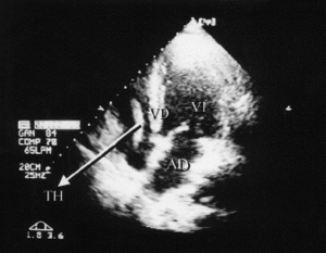 Fig. 1. TH: trombo cardíaco; VD: ventrículo derecho; VI: ventrículo izquierdo; AD: aurícula derecha.