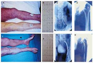 Varón de 67 años que acudió al hospital por dolor torácico, disnea, hipotensión y coloración purpúrea moteada en la extremidad inferior izquierda (fig. 1A). El ECG mostró un patrón S1-Q3-T3 y bloqueo de rama derecha (fig. 1B). La gammagrafía pulmonar demostró un tromboembolismo pulmonar bilateral. Una flebografía de la pierna izquierda puso de manifiesto un trombo masivo que ocupaba la vena ilíaca común (fig. 1C) y una ausencia de relleno de la vena femoral profunda (fig. 1D). Se realizó fibrinólisis sistémica con rt-PA y posteriormente, previa colocación de filtro en la vena cava inferior, trombectomía femoroilíaca. Seguidamente, desapareció el aspecto cerúleo de la extremidad (fig. 1E), el patrón electrocardiográfico de sobrecarga derecha (fig. 1F) y la trombosis de la vena ilíaca (fig. 1G) y femoral (fig. 1H). El diagnóstico fue flegmasia cerulea dolens y tromboembolismo pulmonar.