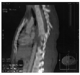 La tomografía computarizada (TC) torácica objetiva fractura-luxación de D7-D8 con hematoma prevertebral y disminución del canal raquídeo en la fractura.