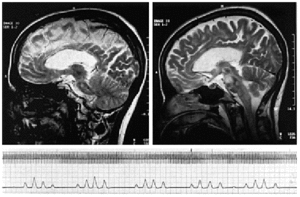 Mujer de 32 años, diagnosticada a los 18 de esclerosis múltiple, que ha cursado de manera recurrente-remitente. En un brote aparecido en febrero de 2001 presentaba, en la resonancia magnética nuclear (RMN), una pequeña lesión nodular hiperintensa localizada en la protuberancia (fig. 1 izda.). En abril de 2002 presenta un brote manifestado por trastorno de la marcha y diplopía horizontal, que evolucionó desfavorablemente hasta presentar hemiparesia izquierda, disartria, incontinencia, crisis tonicoclónicas generalizadas y finalmente coma, por lo que la paciente precisó de ingreso en la UCI. Se realizó una RMN que reveló múltiples áreas de lesión neuronal en protuberancia y mesencéfalo (fig. 1 dcha.). La paciente fue tratada con inmunoglobulinas y plasmaféresis permaneciendo durante todo el ingreso en coma, con GCS 10T y con respiración de Cheyne-Strokes con pausas de apnea de 4-6 s (fig. 1 abajo).
