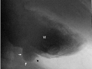 Varón de 81 años, que acudió al hospital por dolor torácico anterior debido a un infarto agudo de miocardio de localización inferior. El paciente fue tratado con un doble bolo de 10 U de reteplasa. A partir del cuarto día de estancia, el enfermo tuvo varios episodios recortados de dolor torácico que aumentaba con la respiración profunda y los movimientos. El electrocardiograma mostraba elevación persistente del segmento ST. El ecocardiograma puso de manifiesto ligero derrame pericárdico con dudosas imágenes ecogénicas en su interior, que sugerían la presencia de coágulos. A los 12 días del ingreso se realizó un estudio hemodinámico que reveló una obstrucción subtotal en la arteria coronaria derecha. La ventriculografía izquierda (proyección oblicua anterior derecha) puso de manifiesto un abultamiento (flechas) en la pared inferoposterior típica de un pseudoaneurisma por rotura subaguda del ventrículo izquierdo. El paciente rechazó el tratamiento quirúrgico y permanecía vivo a los 6 meses.