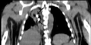 Paciente de 45 años de edad, sin antecedentes médicos de interés, que es remitido a la Unidad de Cuidados Intensivos tras sufrir accidente de tráfico. En la exploración física se aprecia hipoventilación en hemitórax derecho. Ingresa intubado y conectado a ventilación mecánica. Se realiza radiografía de tórax donde se evidencia una atelectasia del hemitórax derecho en el contexto de un traumatismo torácico con existencia de dos cuerpos extraños de densidad radioopaca (fig. 1). Debido a persistencia de alteraciones en la gasometría pese a ventiloterapia, se realizó tomografía computarizada (TC) pulmonar urgente hallándose dos piezas dentarias a nivel endobronquial (fig. 2, reconstrucción coronal). Posteriormente se procedió a extracción de las mismas mediante broncoscopia. Se trataba de una atelectasia postraumática por impactación de dos piezas dentarias a nivel endobronquial.