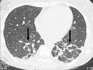 Mujer de 31 años, que ingresa por shock séptico aislándose en dos hemocultivos Staphylococcus aureus en paciente con neutropenia febril de 5 días de evolución tras ciclo de consolidación de linfoma no Hodgkin B, por lo que recibió tratamiento antibiótico empírico en un primer momento con vancomicina e imipenem y posteriormente dirigido con cloxacilina y la retirada del catéter de Hickman, cuyo cultivo semicuantitativo fue negativo. No precisó ventilación mecánica. La radiografía (Rx) de tórax fue normal. Al no encontrar foco evidente de infección se realiza tomografía axial computarizada (TAC) torácica a su ingreso que muestra mínimos cambios consistentes en engrosamiento discretamente irregular de los septos interlobulillares de ambos lóbulos inferiores en su porción posterior, diagnosticándose de neumonía (fig. 1; flechas negras). La paciente evoluciona de forma satisfactoria, desapareciendo la fiebre, pudiéndose retirar los inotrópicos y vasopresores y mejorando la relación PaO2/FiO2; recupera la neutropenia a los 10 días de ingreso en que se realiza TAC de control que confirma consolidación alveolar bilateral (fig. 2; flechas blancas).