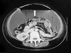 Exponemos el caso de una mujer de 38 años que sufre accidente de tráfico e ingresa en nuestro Centro en situación de shock hipovolémico con fracturas costales múltiples, neumotórax y contusión pulmonar bilateral. Entre las pruebas complementarias realizadas a su ingreso destacan una ecografía y una tomografía axial computarizada (TAC) de abdomen normales. Durante su estancia en el Servicio de Medicina Intensiva se repite dos veces la ecografía abdominal, que muestra una pequeña cantidad de líquido perihepático y entre asas y una colección líquida con ecos en su interior en región prehepática muy superficial en relación con hematoma de pared. A los 19 días, por intolerancia a la alimentación enteral y desarrollo de distensión abdominal se realiza otra TAC (fig. 1) que muestra una gran cantidad de líquido ascítico con gas en su interior en forma de burbujas (flechas negras) y un gran nivel hidroaéreo (flecha blanca). Se interviene a la paciente de urgencia, encontrando un gran neumoperitoneo y aproximadamente 2 litros de líquido intestinal secundario a un desgarro del meso del íleon terminal con necrosis completa y perforación de unos 30 cm.