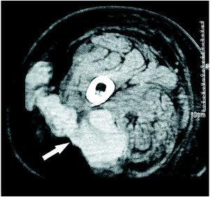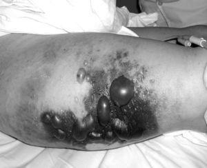 Una mujer de 80 años con factores de riesgo cardiovascular y accidentes isquémicos transitorios repetidos y que recibía tratamiento con acenocumarol y enalapril sufrió un atropello. La paciente presentaba inestabilidad hemodinámica marcada, objetivándose un hematoma de gran volumen en el muslo derecho. Precisó estabilización con cristaloides, concentrados de hematíes y plasma junto con vitamina K con normalización del valor de INR tras 24 h, con posterior aparición de ampollas cutáneas (fig. 1) y valores de presión intracompartimental siempre menores de 30 mmHg, por lo que se decidió actitud conservadora. Se realizó una tomografía axial computarizada que mostró un hematoma del músculo glúteo superior que se extendía al compartimento posterior del muslo y al tejido subcutáneo (fig. 2, flecha). La paciente evolucionó sin complicaciones.