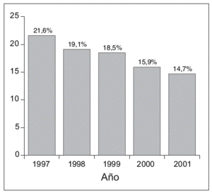 Mediante un diseño observacional prospectivo utilizando los datos aportados por el ITR (Israel Trauma National Registry), creado y esponsorizado por el STI, estudian la evolución cronológica de la mortalidad en los seis hospitales categorizados como de referencia traumatológica entre los años 1997-2001. Los más que favorables resultados constan en la figura 1. El descenso paulatino de la mortalidad desde un 22 hasta un 15% en cinco años es muy importante, así como el descenso correlativo del riesgo de muerte en cada año pasado.