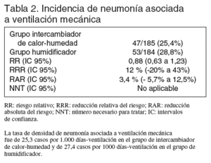Conclusiones de los autores: ninguno de los sistemas de humidificación muestra una ventaja en el impacto sobre la neumonía asociada a la ventilación mecánica y pueden ser utilizados indistintamente.