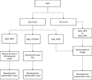 FiO2 adjustment protocolA FiO2 adjustment protocol was already applied in one of the participant ICUs. The same protocol was also applied in the ICU dedicated to COVID-19 patients in this hospital (conservative-oxygen ICU). According to this protocol, patients under MV and with positive end-expiratory pressure (PEEP) equal or lower than 8cmH2O were evaluated every 1h by a nurse, who adjusted FiO2 based on SpO2. If SpO2 was higher than 96%, FiO2 was reduced in 10% (absolute value); if SpO2 was between 93% and 96%, FiO2 was maintained; and if SpO2 was lower than 93%, the doctor in charge was called. In patients with PEEP higher than 8cmH2O, the nurses did not adjust FiO2, but they called the doctor in charge if SpO2 was lower than 93% (eFigure 1 in Supplementary Appendix). In the other hospital, the ICU dedicated to COVID-19 patients did not adopt any FiO2 protocol and constituted the control-ICU.