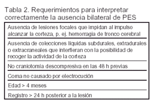 Conclusiones de los autores: la ausencia bilateral de PES proporciona una estimación precisa del mal pronóstico en los pacientes con lesión cerebral aguda y grave.