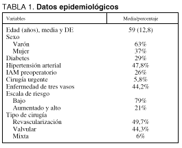 1. Relativas a factores de riesgo y datos epidemiológicos. Edad, sexo, factores de riesgo cardiovascular (diabetes e hipertensión), estudio angiográfico (existencia o no de enfermedad coronaria de tres vasos), presencia de infarto preoperatorio y fracción de eyección preoperatoria. Se clasificaron los pacientes según la escala de riesgo quirúrgico de Tuman, que divide a los pacientes en tres niveles de riesgo: bajo, aumentado y elevado8. En nuestro estudio se agrupan en dos categorías: bajo riesgo, propiamente dicho, y riesgo aumentado.