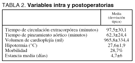 En la tabla 1 se establecen las características clínicas y demográficas de nuestra casuística quirúrgica. En la tabla 2 aparecen los valores de las variables intra y postoperatorias. El 28,7% de los pacientes presentaron morbilidad con los criterios establecidos; de ellos, un 70% presentaban síndrome de bajo gasto. La estancia media fue 4,7 (6) días con un rango de 1-54 días.