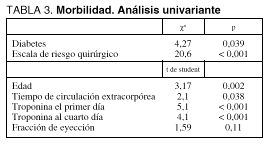 En nuestra casuística, con la limitación del tamaño de la muestra y aplicando un análisis de regresión logística, hemos encontrado tres variables predictoras de la aparición de la morbilidad postoperatoria, que son la edad del paciente, la categoría de riesgo según la escala de Tuman modificada y un valor de troponina I > 10 ng/ml a las 24 h del inicio de la cirugía cardíaca.