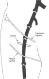 Esquema que representa la zona de realización de la bolsa del generador de forma caudal al ligamento inguinal.
