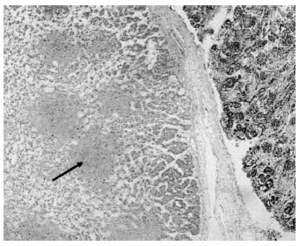 Figura 1. Microabscesos por infección de L. monocytogenes en la glándula suprarrenal. Hematoxilina-eosina. 10X.