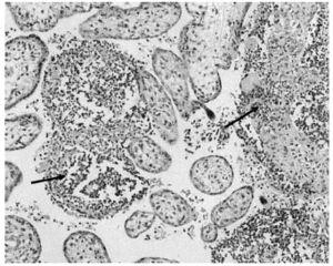 La transmisión al feto de Listeria en nuestra paciente debió ocurrir por vía transplacentaria a través de la sangre materna, ya que la negatividad del cultivo del exudado vaginal descartó la vía ascendente desde la vagina contaminada o la transmisión al feto a su paso por el canal del parto2,6. A pesar de la baja incidencia de portadoras sanas de Listeria a nivel genital, éste debe ser un elemento a tener en cuenta, ya que podría tratarse de un factor predisponente a padecer abortos de repetición6.