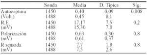 Conclusión: Ambos tipos de sonda son adecuadas por su baja polarización, sin apreciarse diferencias entre ambas en cuanto a polarización, respuesta evocada y onda R sensada. El umbral de captura es significativamente menor con la sonda 1450.