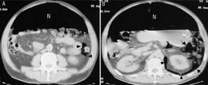 Figura 1. Una tomografía computarizada abdominal con contraste evidencia neumoperitoneo masivo (N), aire pericólico izquierdo extraluminal e intraperitoneal (flechas) (A) y retroneumoperitoneo que delimita el riñón izquierdo (flechas) (B).