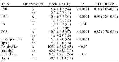 Se comprueba la utilidad en niños de TSR y TS-T. TSR no mejora la predicción de supervivencia precoz de TSR-T, a diferencia del trabajo de Champion. IS no es útil para predecir supervivencia, distinto al resultado en adultos (podría explicarse la mayor capacidad de compensación del niño). El GCS aislado tiene una capacidad predictora cercana a la de TSR y TS-T.