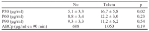Un P30 de 10 (µg/ml) clasificaría correctamente la tolerancia o no de estas 12 determinaciones, eligiendo este valor para evaluar el valor predictivo en los siguientes pacientes a los que se administra NE y presentan un residuo gástrico superior a 200 ml (n = 9). De ellos 8 tienen un P 30 superior a 10 µg/ml y en los 8 se consigue progresar en las siguientes 24 horas hasta 63 ml/h, mientras que sólo 1 vuelve a presentar criterios de intolerancia y en este caso el P 30 fue menor de 2 µg/ml. Valor predictivo positivo 100% y Valor predictivo negativo 100%.