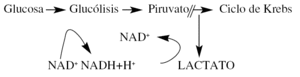 El lactato se produce durante el metabolismo anaeróbico a causa del bloqueo del ciclo de Krebs en ausencia de oxígeno. Puesto que, en estas condiciones, el NAD+ no se puede regenerar a partir de NADH, no hay NAD+ disponible para la glucólisis. Puesto que la glucólisis requiere el aporte constante de NAD+, el piruvato se convierte en lactato en el citosol produciéndose una molécula de NAD+.