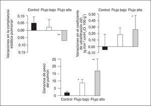 Figura 3. Cambios en la compliancia pulmonar, en el coeficiente de ultrafiltración (Kf) y en el peso del pulmón. Tomada con permiso de la referencia 40. *p < 0,05 para la comparación con el grupo control. **p < 0,05 para la comparación con los grupos control y flujo bajo.