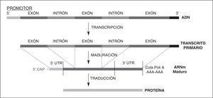 Figura 1. Estructura de un gen, transcripción y traducción a proteína.