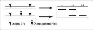 Figura 2. Polimorfismos del tamaño de fragmentos de restricción (RFLP). La pérdida o ganancia de una diana de restricción por efecto de la sustitución de un nucleótido puede ser detectado por las variaciones en los tamaños de los fragmentos de restricción. En la figura se presenta el resultado esperado de este tipo de polimorfismos en individuos homocigotos para la presencia de la diana (+ +), los homocigotos para la ausencia de diana (- -) y los heterocigotos (+ -). ER: enzima de restricción.