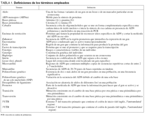 El tipo más frecuente de PG es el de un solo nucleótido, o diferencias de una sola base que aparecen en la secuencia del ADN entre individuos de una población. Se estima que 1 de cada 200-300 bases del ADN humano podría ser un SNP2. Los SNP pueden ocurrir tanto en regiones codificadoras (exones) como en no-codificadoras (intrones y promotores) del genoma (fig. 1). Debido a que sólo el 3%-5% del ADN humano codifica para la producción de proteínas, la mayoría de los SNP se encuentran fuera de las regiones codificadoras. Cuando el SNP ocurre dentro de la región codificadora del gen, o exón, la probabilidad de que se altere la función biológica de la proteína es mayor, ya que el cambio de base puede traducirse en la sustitución de un aminoácido por otro.