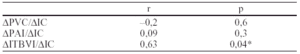 Resultados: Se estudiaron 10 pacientes. Los coeficientes de correlación y su significación estadística (*) entre los diferentes parámetros se muestran en la siguiente tabla: