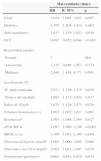 | Hemoglobina (g/dl) | 0,928 | 0,844; 1,020 | 0,123 | 0,914 | 0,839; 0,996 | 0,040 |